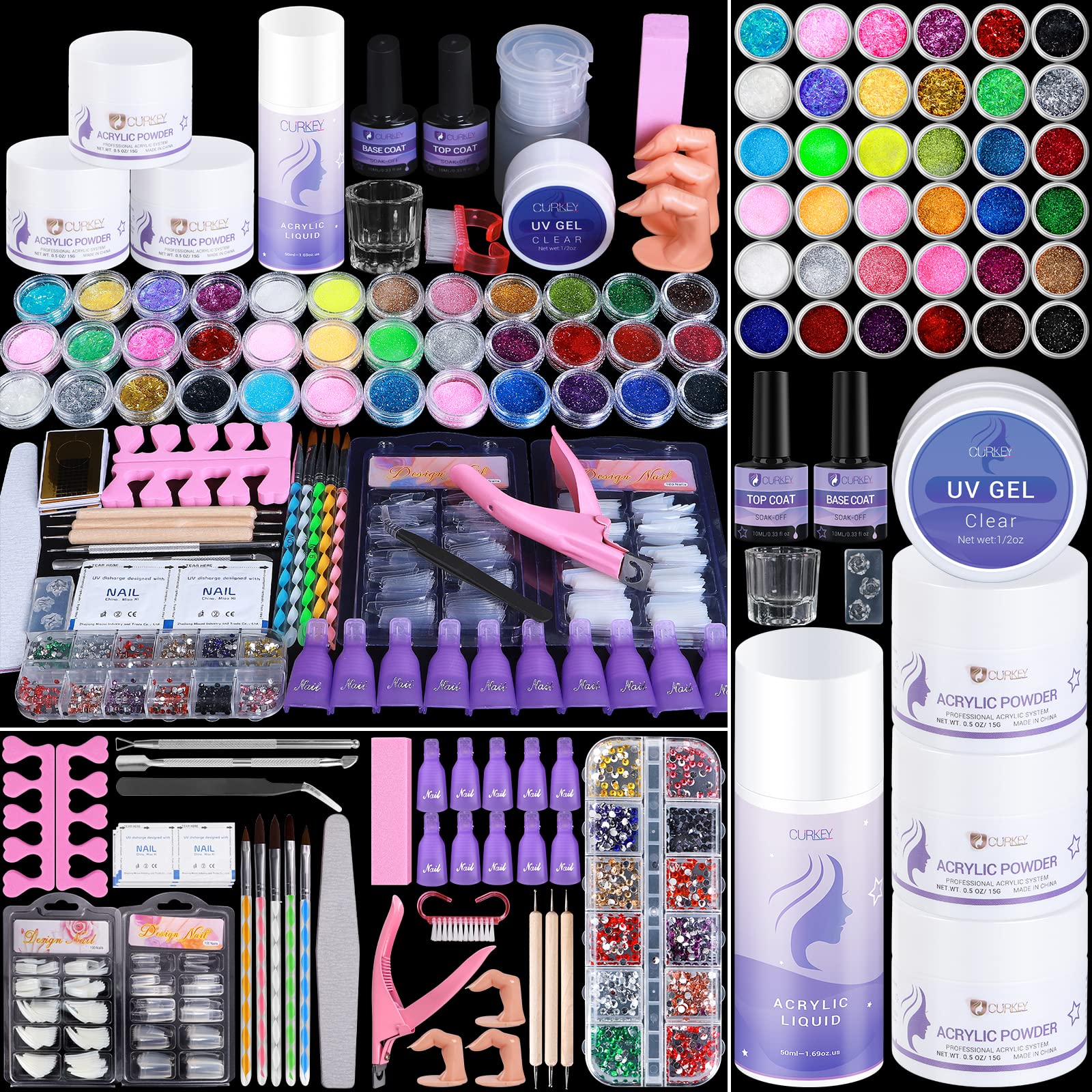 - 💕【 Acrilic Nail Kit Liquid Monomer Set 】 This complete nail kit professional acrylic with everything you need for all process—3 colors acrylic powder, 50ml Acrylic liquid, glitter powder and sequins, 10ML gel top and base coat, acrylic nail brush, nail rhinestones and other nail art supplies for nail tech. Quite convenient and practical, No need to buy extra stuff. Perfect for doing nail art design at home studio or salon