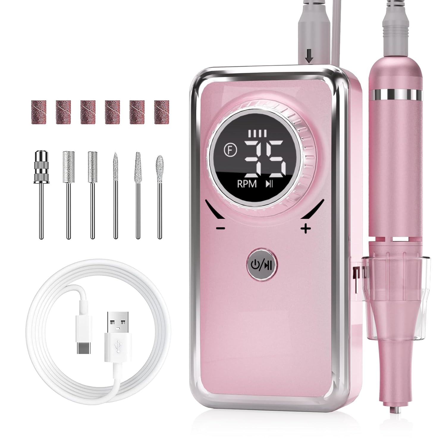 Electric Nail Drill-35000RPM Portable Acrylic Gel Polish Remover Nail Drill Machine with 6 Nail Bits, Professional Manicure Pedicure Polishing Tools for Home Salon, Pink