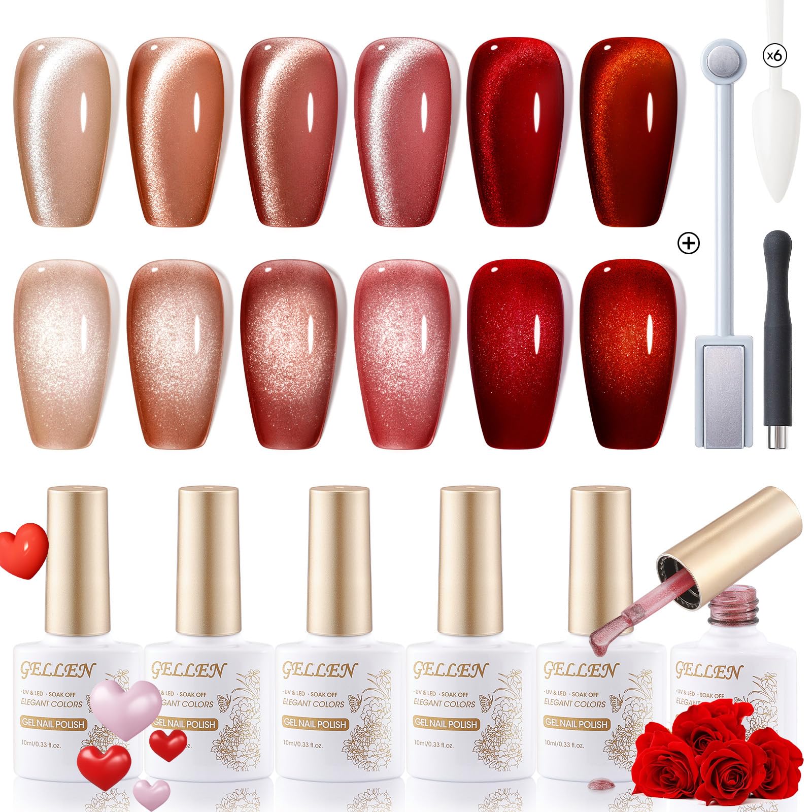 Gellen Glitter Cat Eye Gel Nail Polish Set 6 Colors Red Burgundy Gel Nail Polish with Magnet UV LED Soak Off Sparkle Nail Polish Kit Magnetic Gel Polish Set for DIY Nail Art Women Valentine’s Day Gift