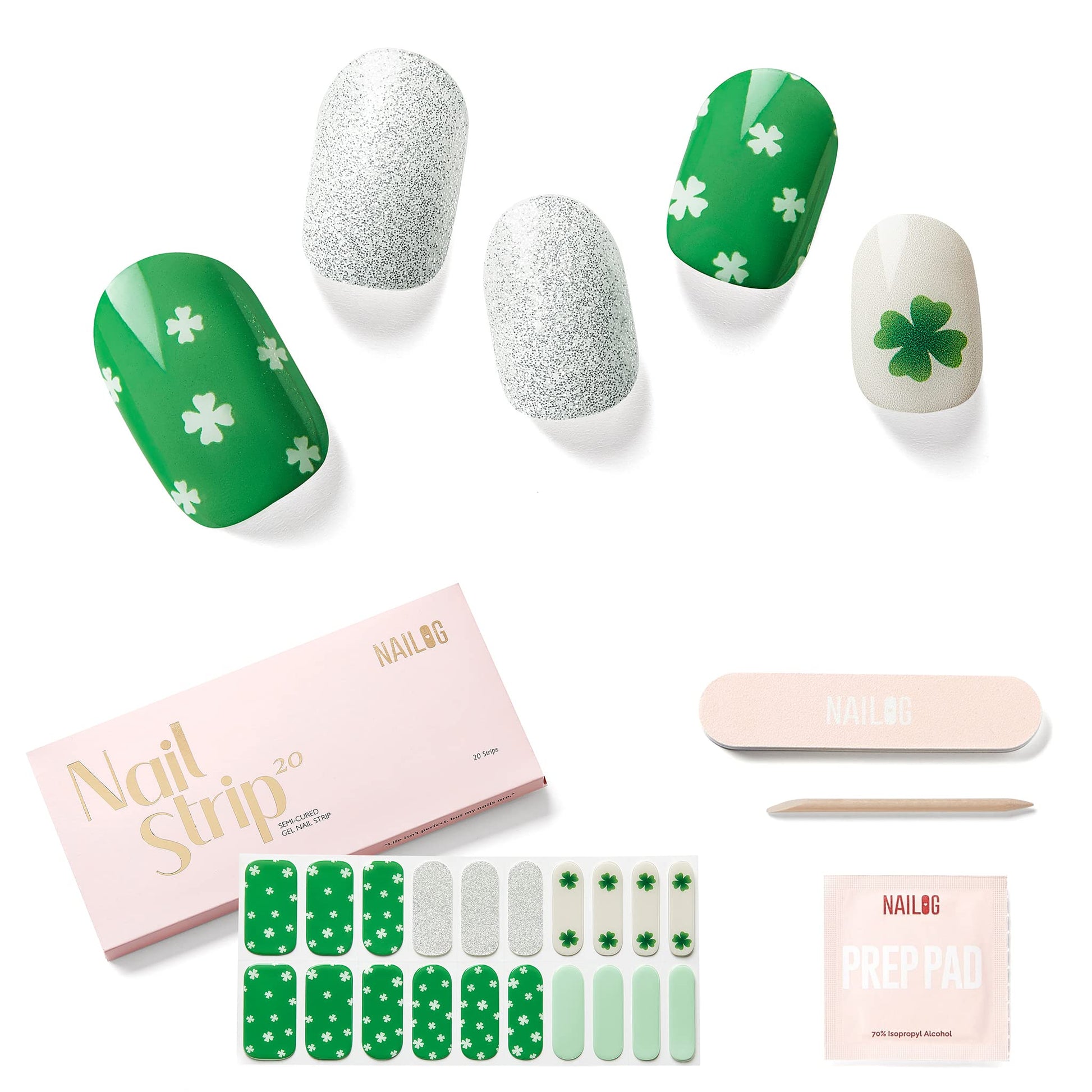 NAILOG Semi Cured Gel Nail Strips for Spring (20 Extra Long Stickers/Wraps) | Glossy & Long Lasting Soft Gel Finishing | The Shamrock