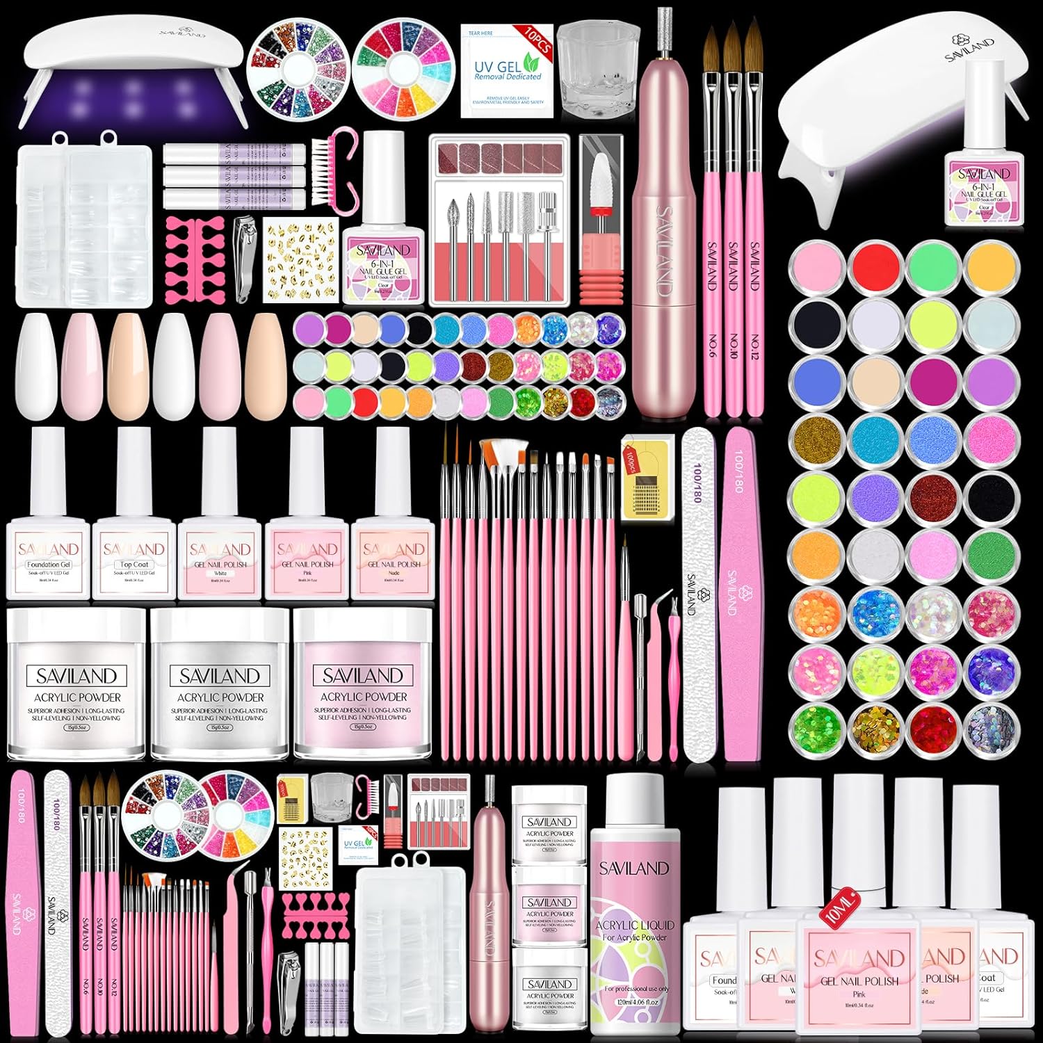 💅MINI NAIL LAMP & 6 IN 1NAIL GLUE GEL -Saviland acrylic nail kit has a mini nail lamp, can cure base and top gel, nail glue gel, gel polish and other all kinds of U V nail gels. It is compact design and portable, easy to carry, can help you cure your nail art anywhere. The nail glue gel in this acrylic tools kit has 6 in 1 functions, can use as nail glue gel, foundation gel, slip solution, self-leveling gel, nail strengthener gel and nail decoration glue gel.