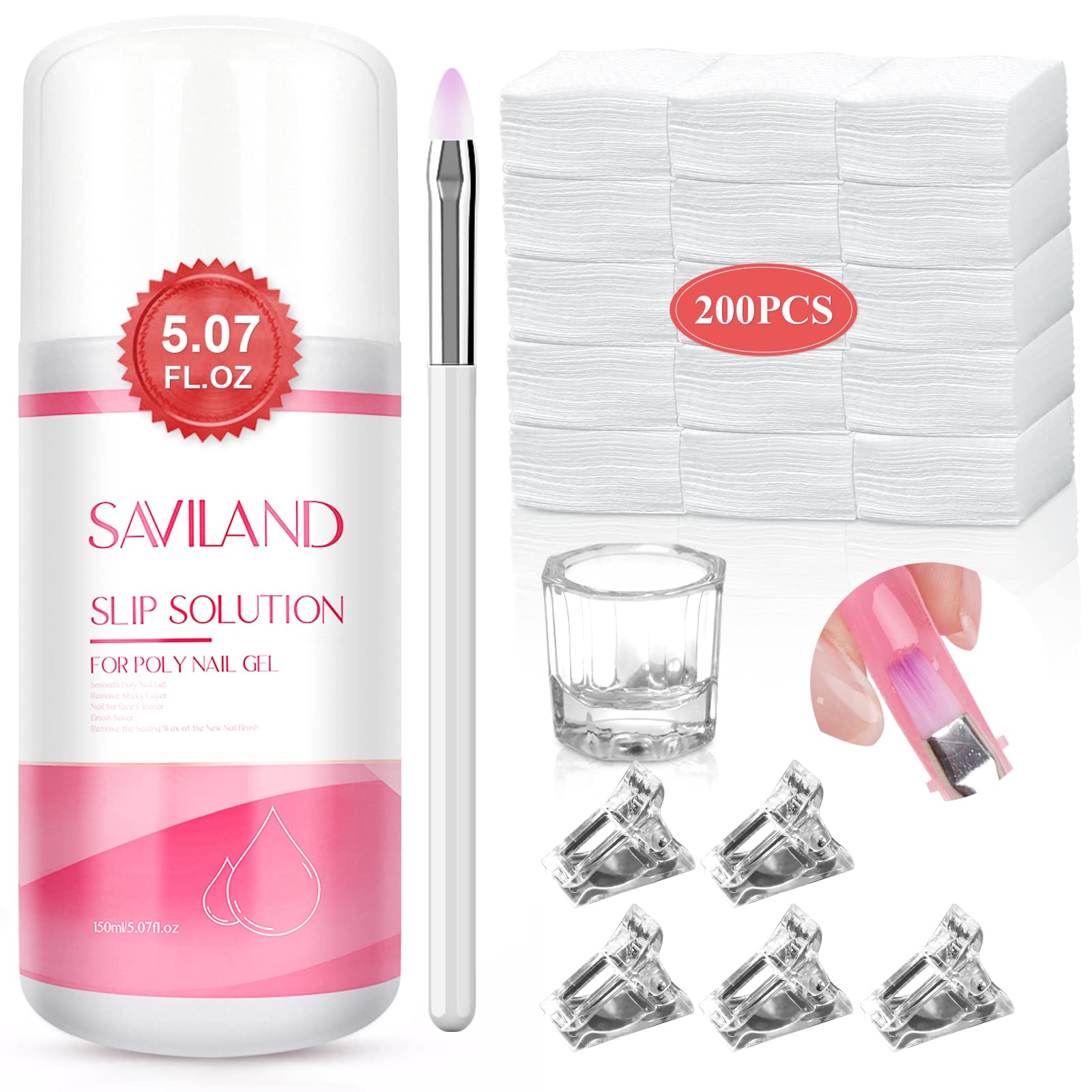 - Great For Beginners Silp Solution Kit- Saviland poly gel slip solutions contains a large capacity of 150ml slip solution, larger volume for beginner to pratice, 1pc gel nail brush, 5pcs nail clips, 200pcs cleaning cotton pads, 1pc glass dappen dish. A complete poly gel slip solution kit for creating poly gel nails, perfect for beginners to DIY at home. Poly Gel Slip Solution provide you a salon-quality manicure experience. It is also a perfect gift set for wife, Daughter and Friends and others.
